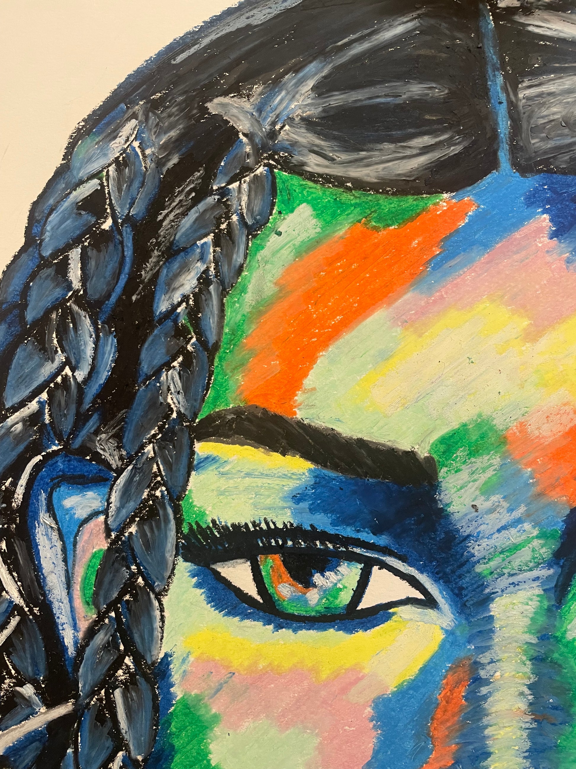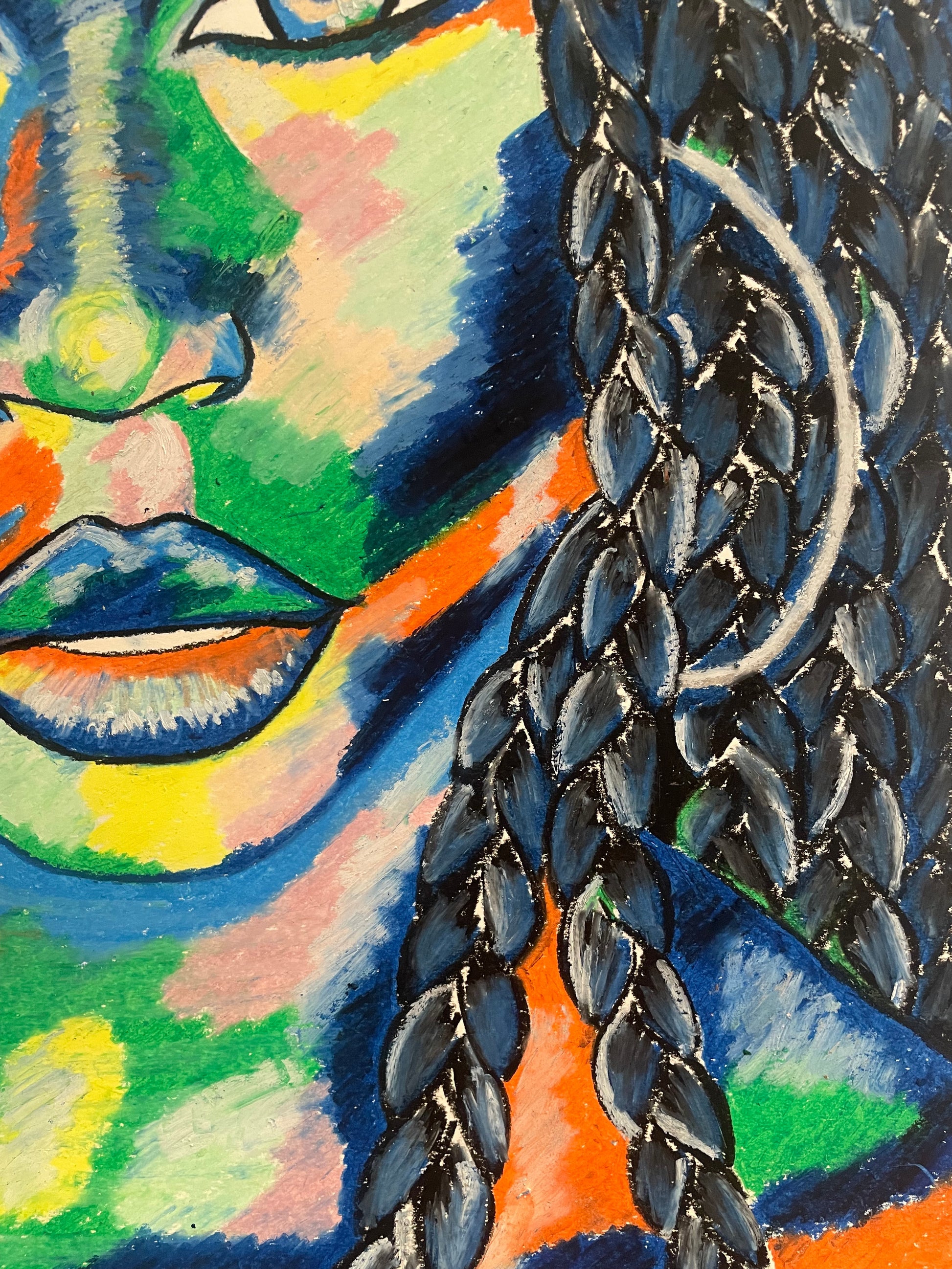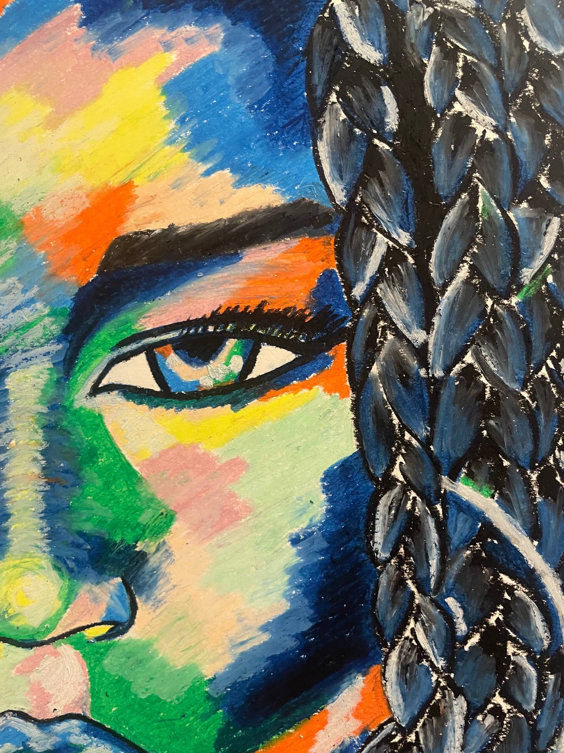 Dark blue, a prominent colour in the piece, symbolises this depth, further enhancing the portrait's emotional resonance.
