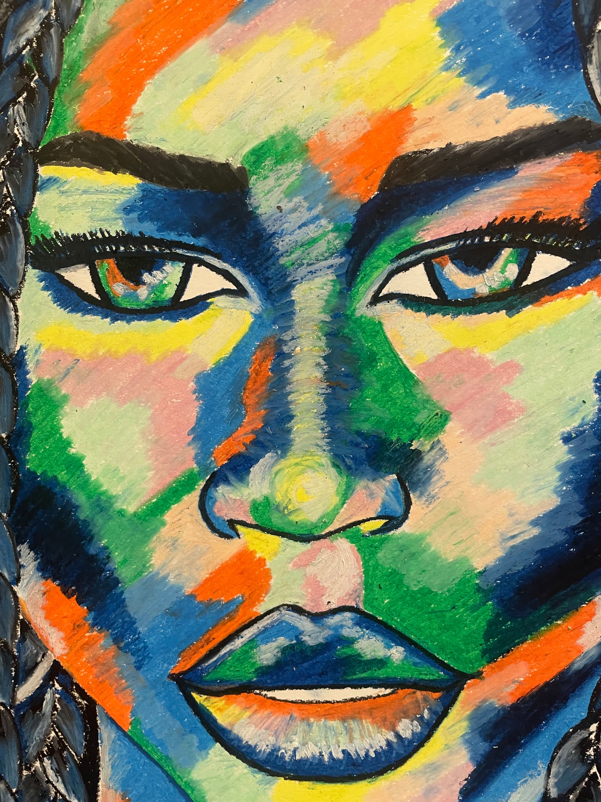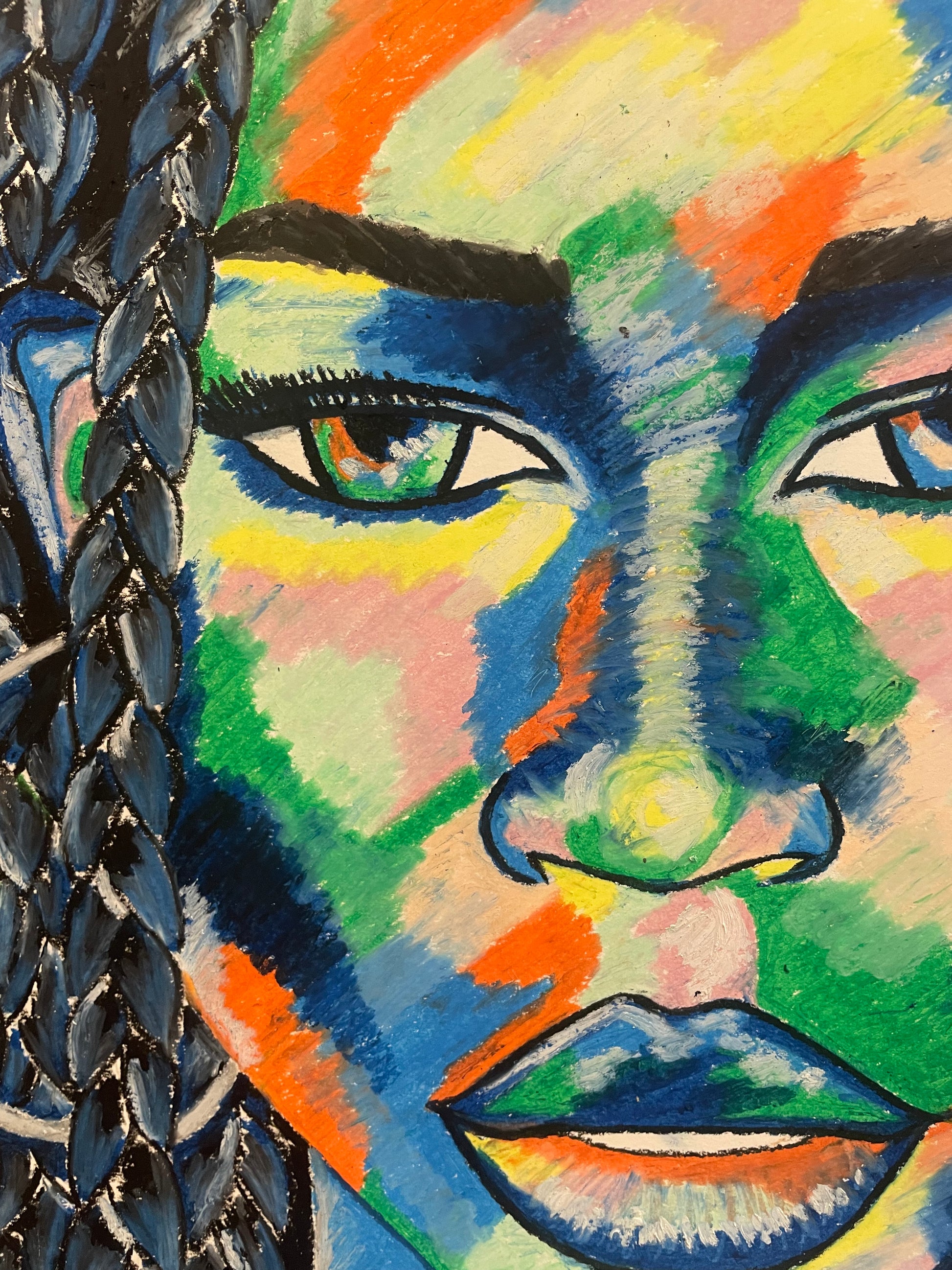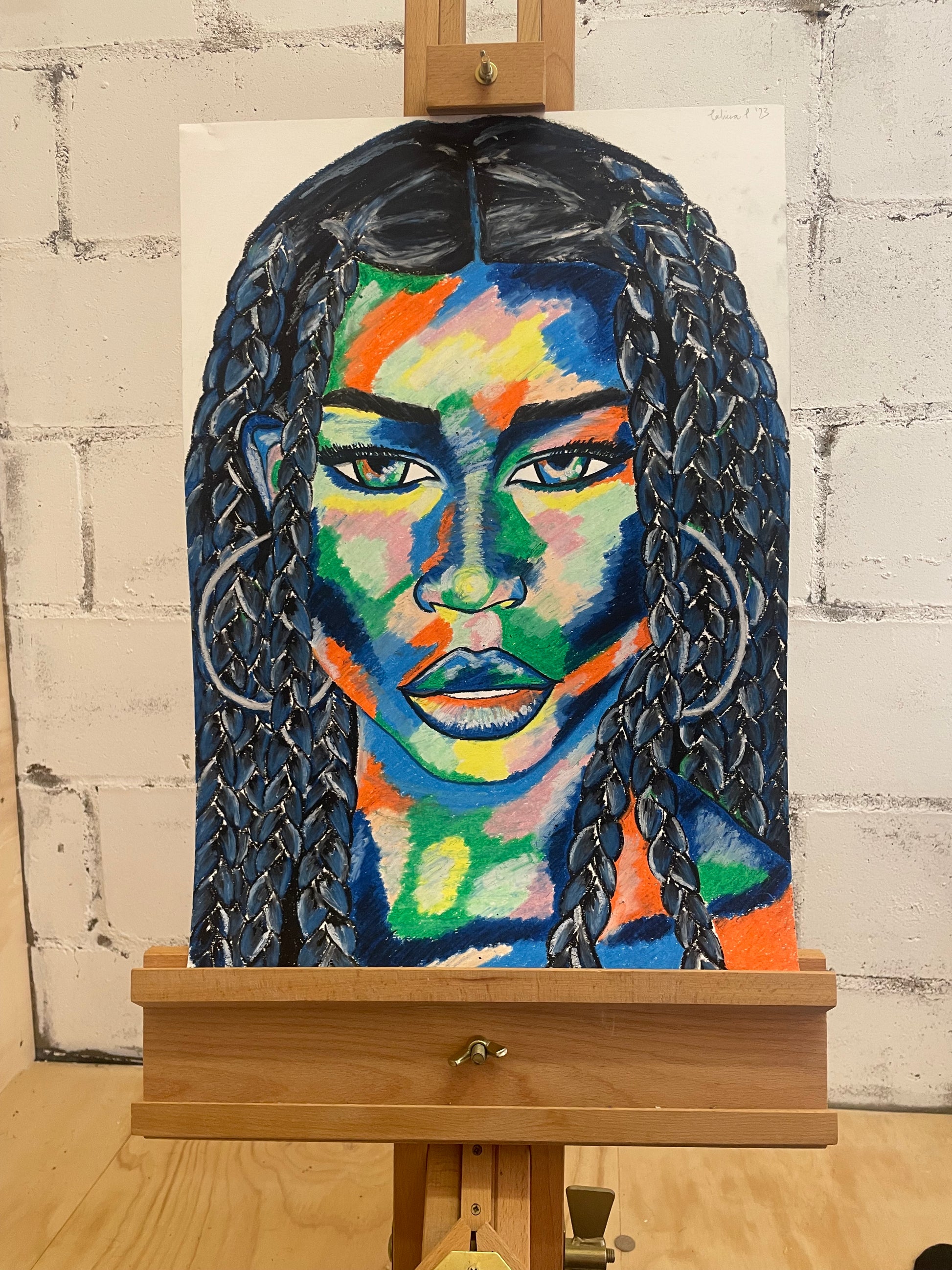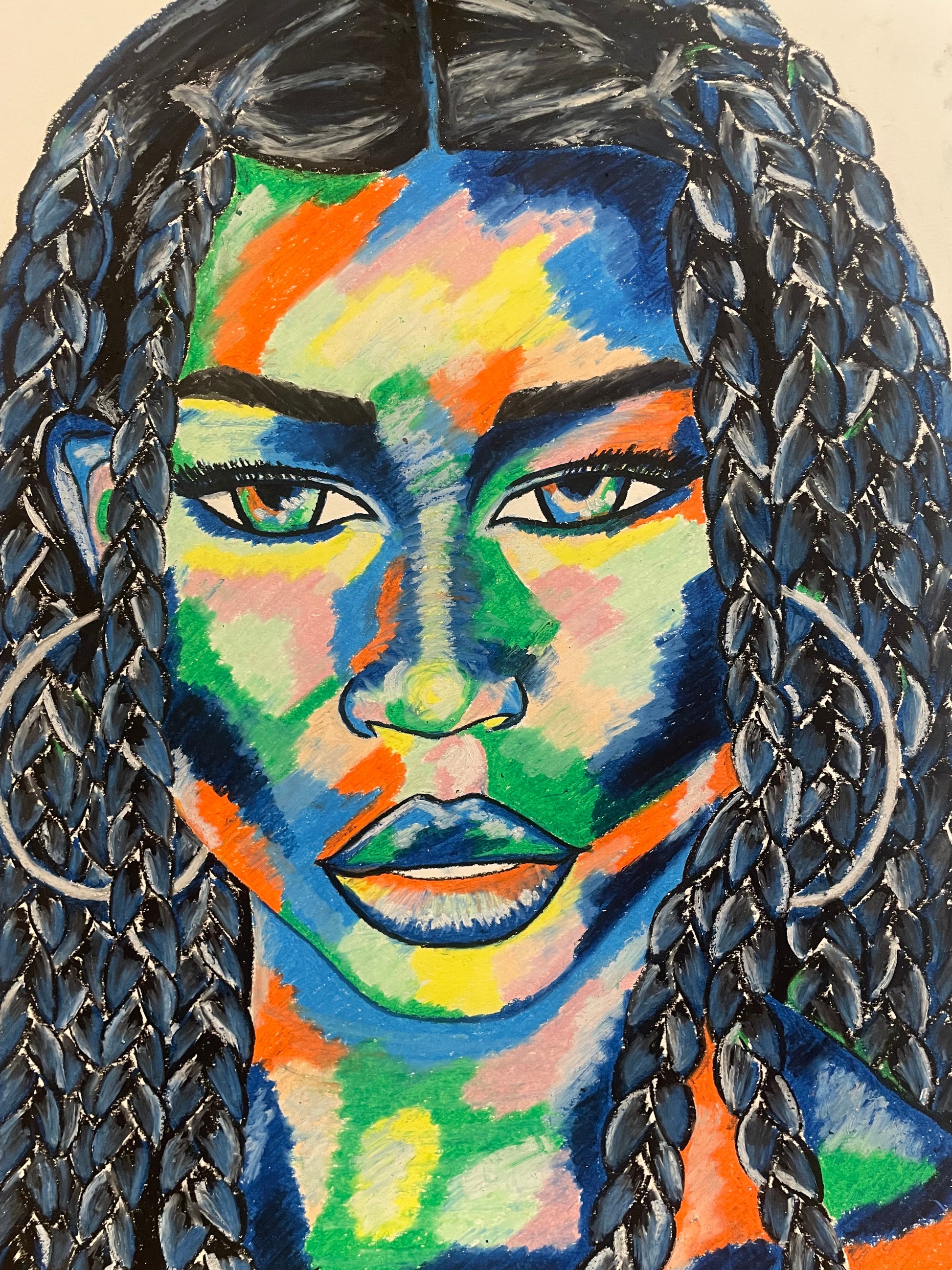 Dark blue, a prominent colour in the piece, symbolises this depth, further enhancing the portrait's emotional resonance.