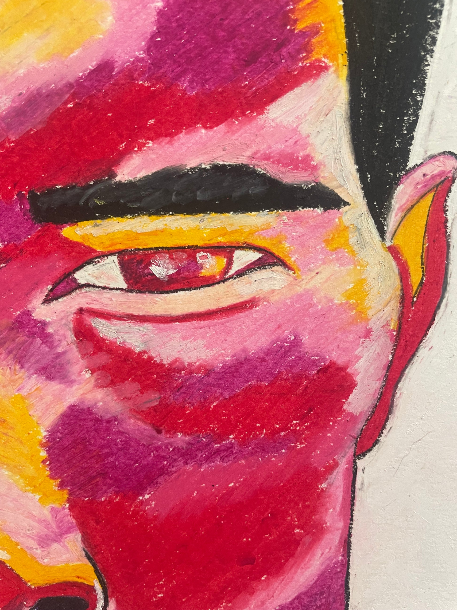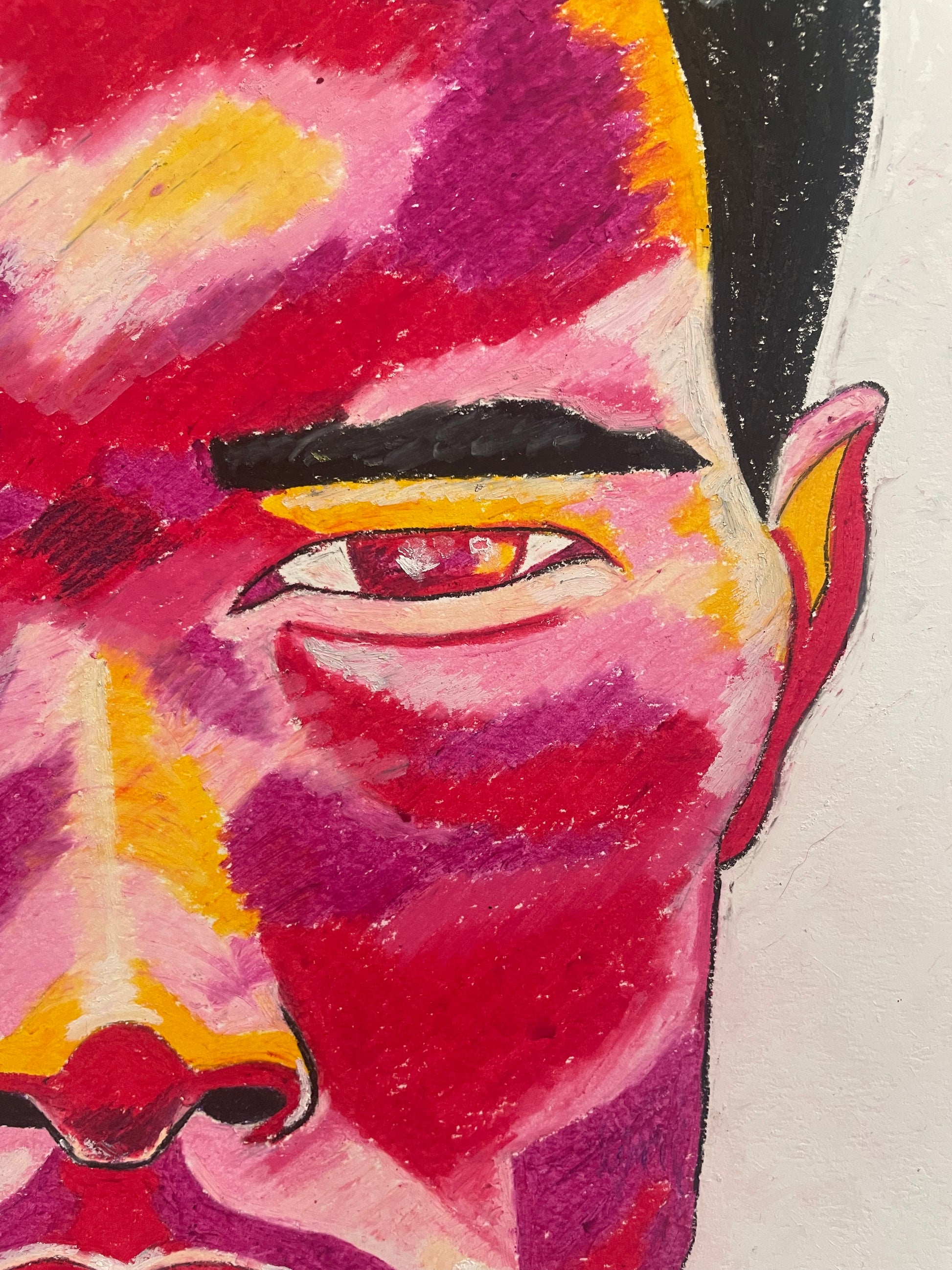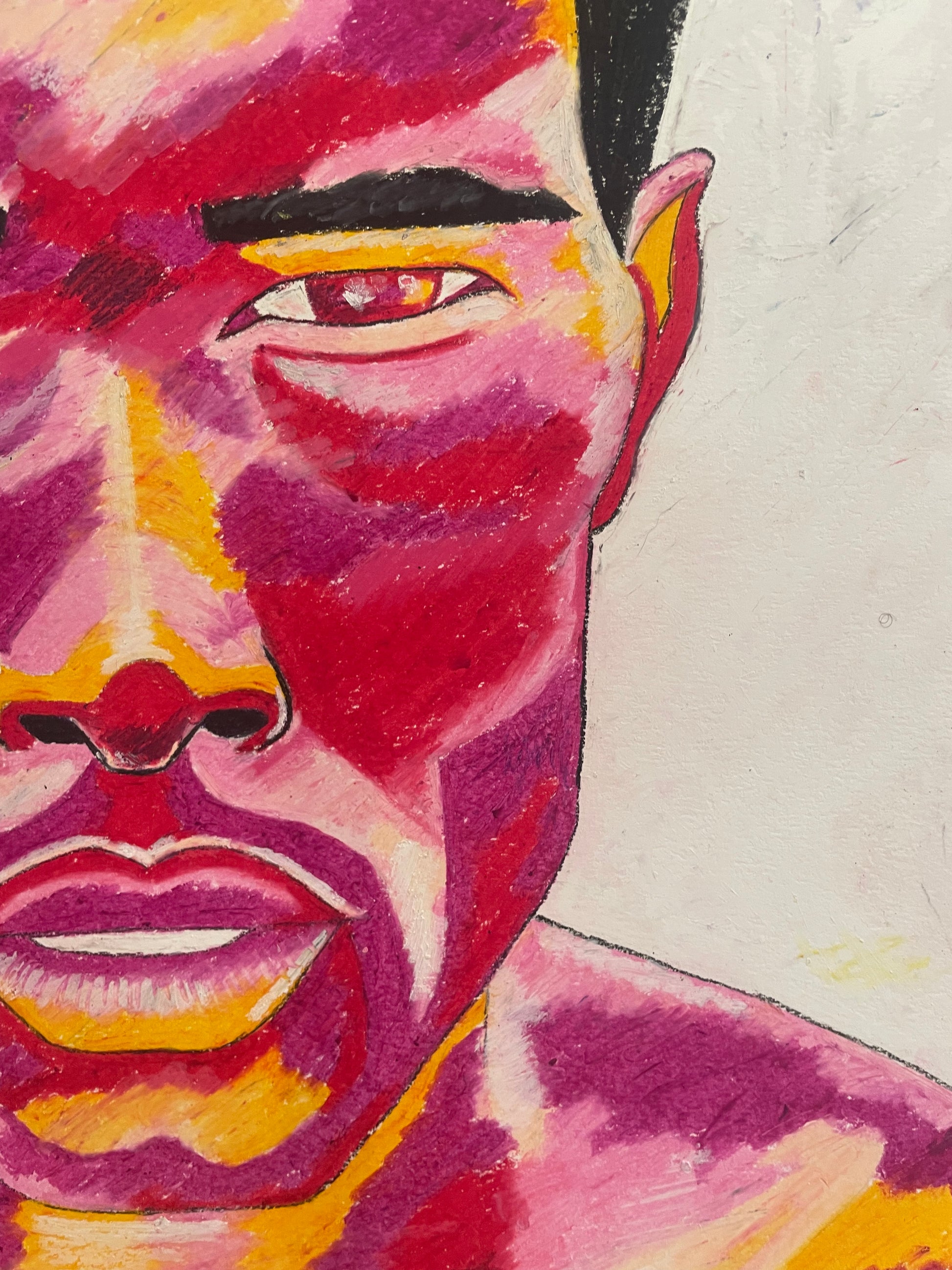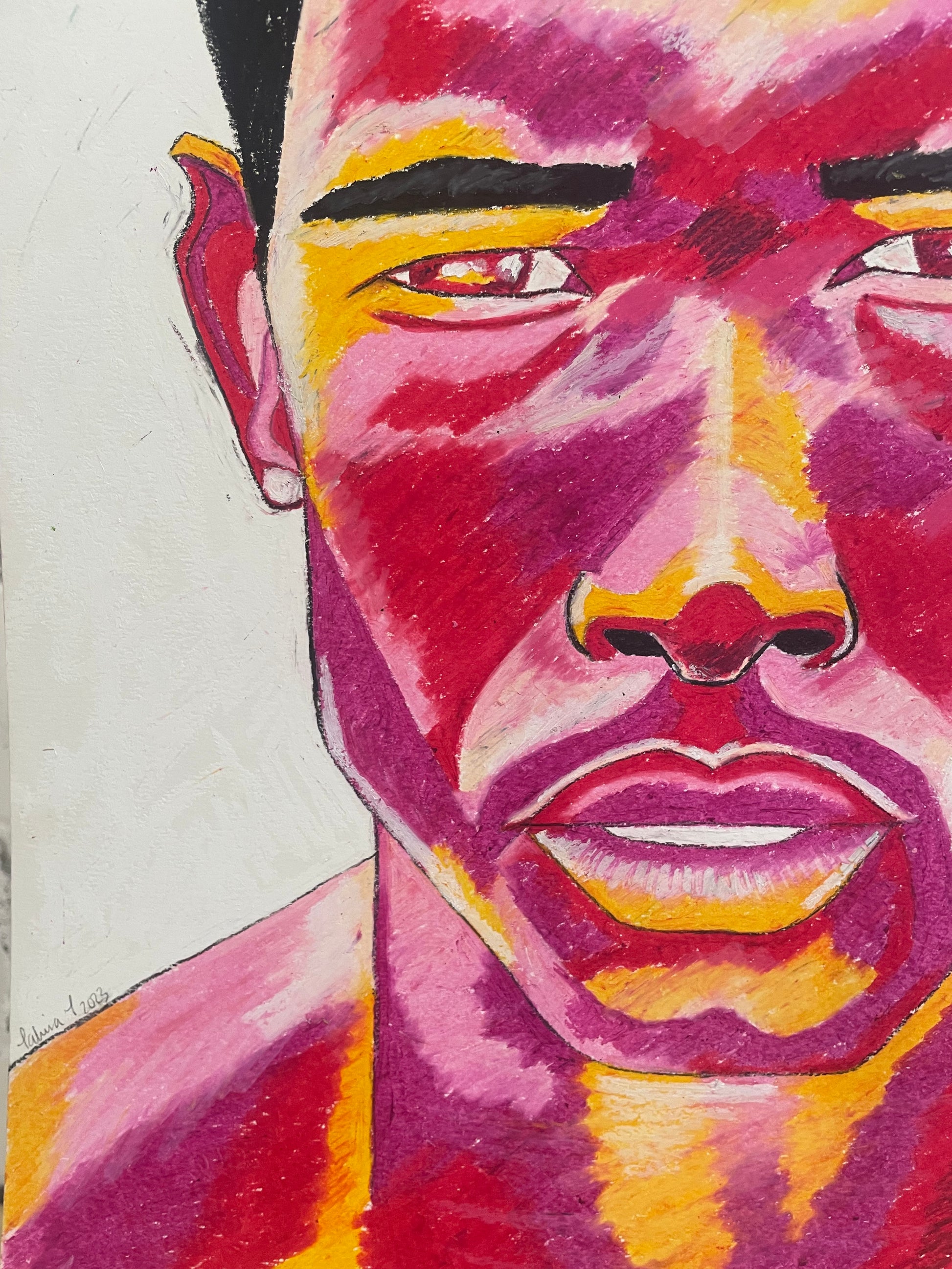 One day, I made a striking observation about my art: every male portrait I had created prominently featured the colour blue. It dawned on me that societal norms had ingrained in me the association of blue with masculinity. Determined to challenge this conditioning, I embarked on a portrait of a man with vibrant shades of pink, traditionally linked with femininity.