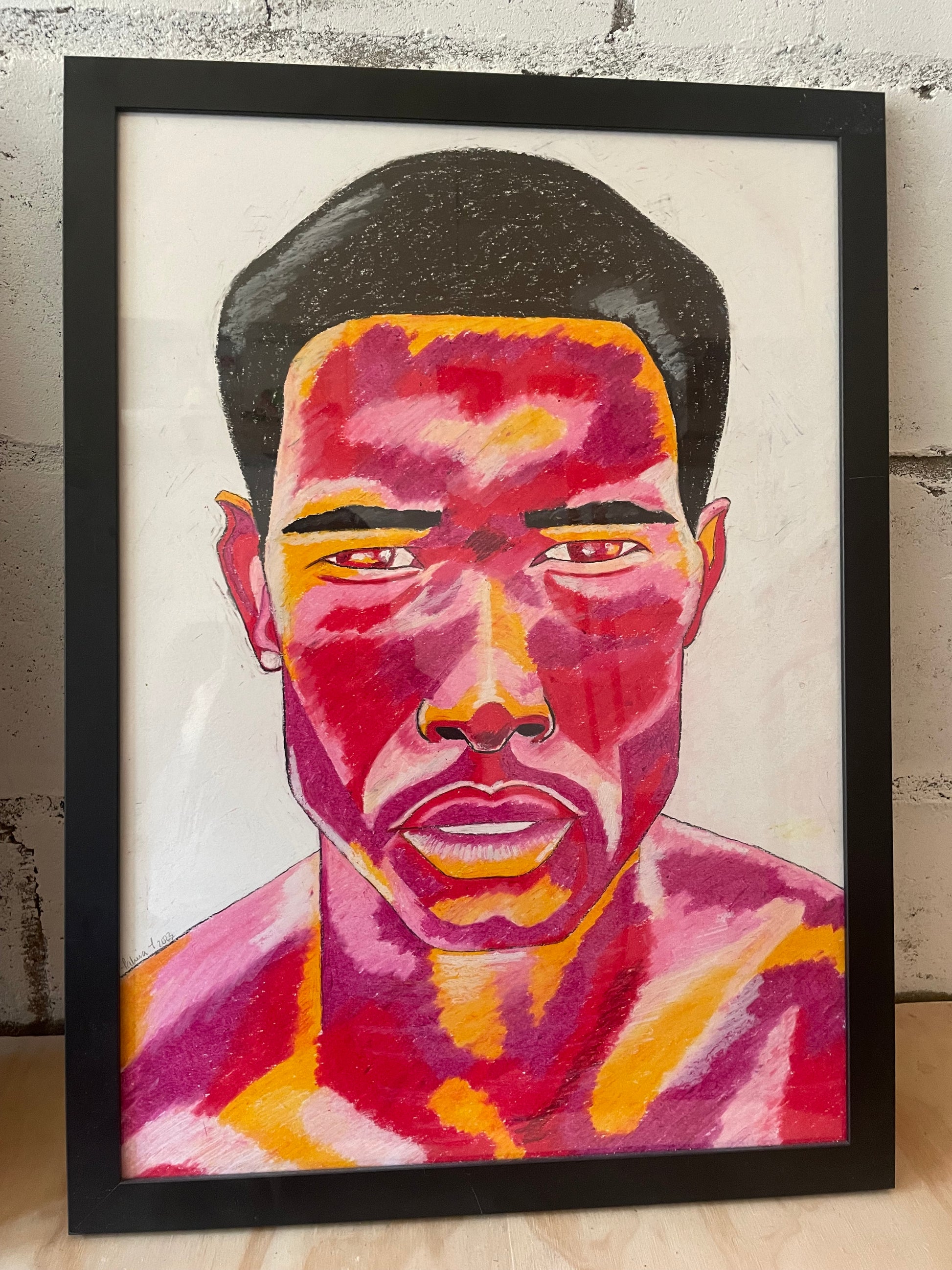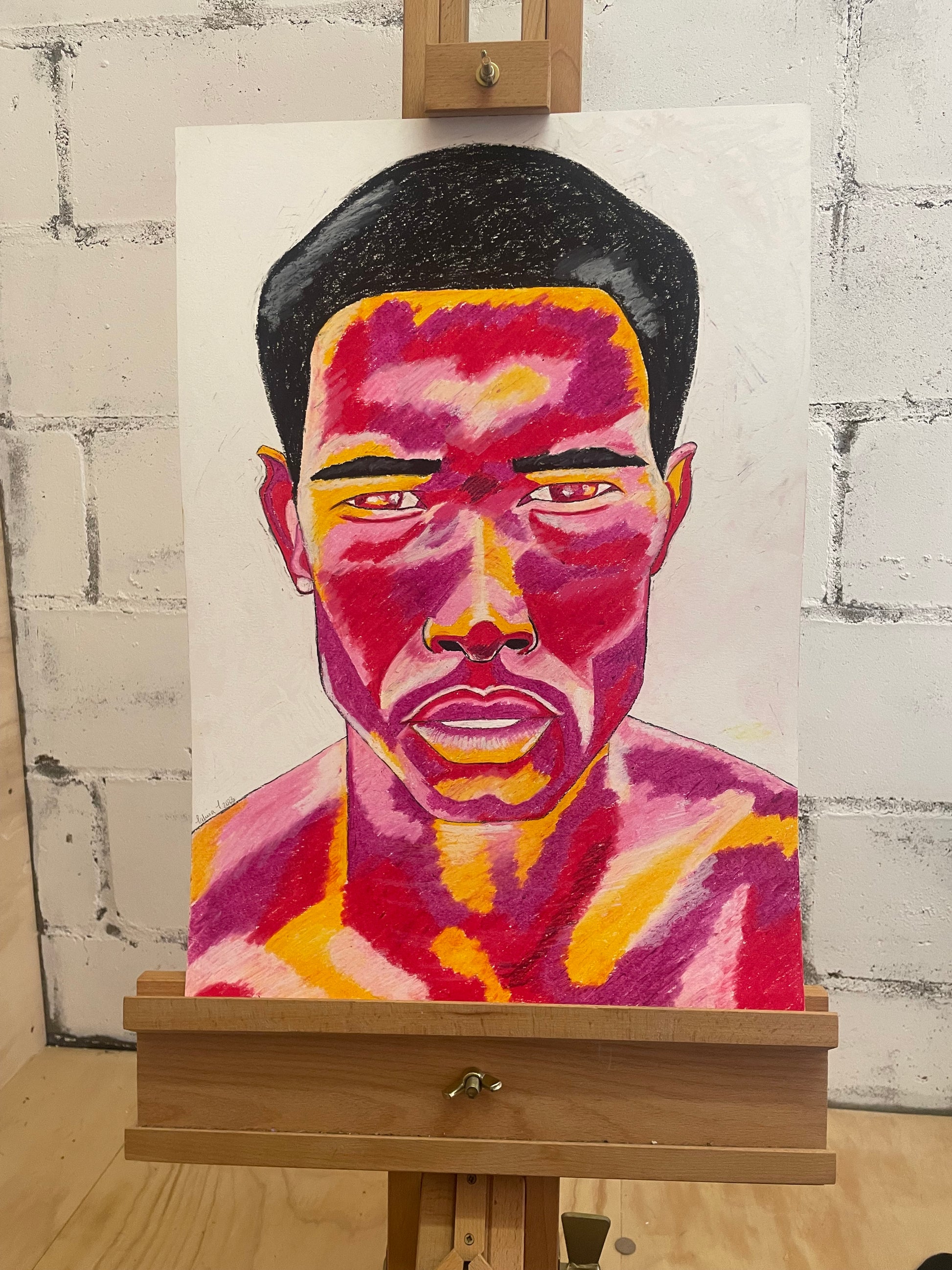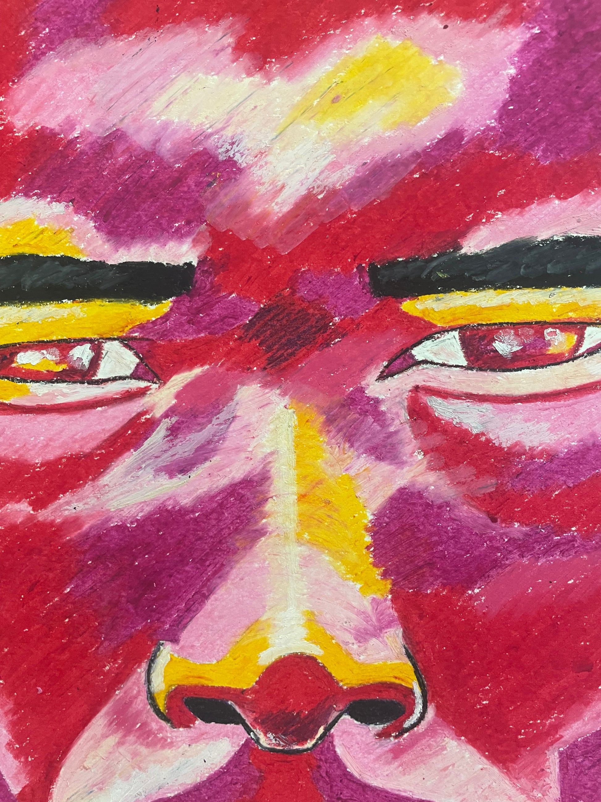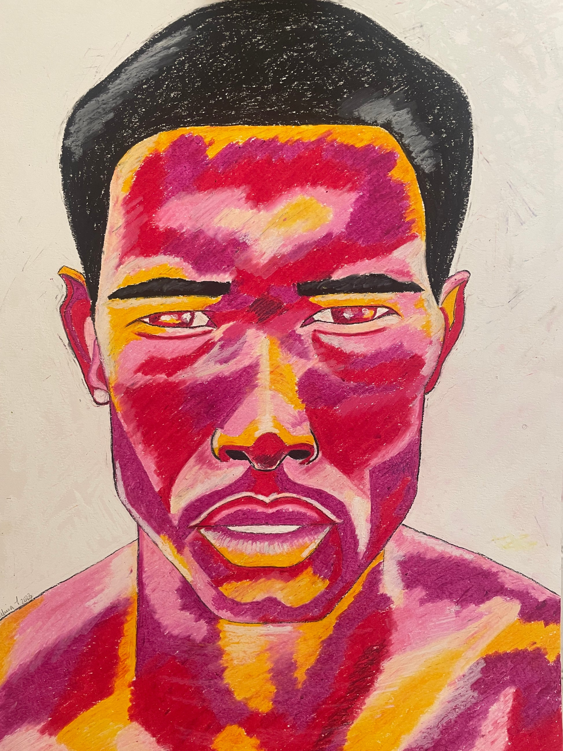 One day, I made a striking observation about my art: every male portrait I had created prominently featured the colour blue. It dawned on me that societal norms had ingrained in me the association of blue with masculinity. Determined to challenge this conditioning, I embarked on a portrait of a man with vibrant shades of pink, traditionally linked with femininity.